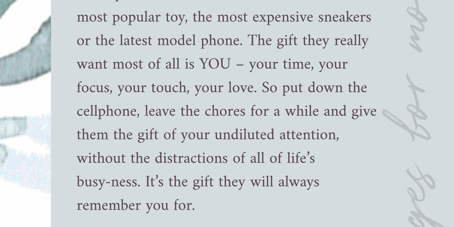 So put down the cellphone, leave the chores for a while and give them the gift of your undiluted attention, without the distractions of all of life’s busy-ness.
