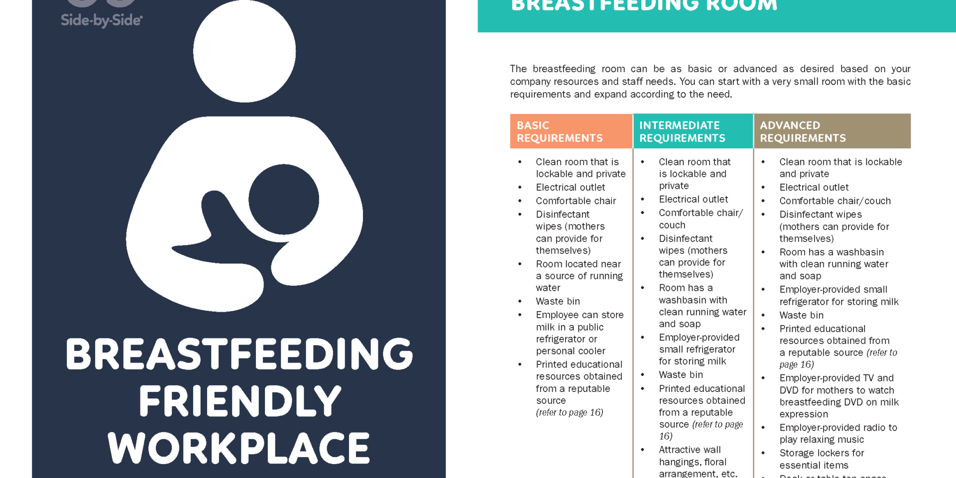 Side-by-Side is a national campaign working to ensure that all children under 5 receive the nurturing care. The campaign has developed a guide to “Breastfeeding in the Workplace”. This guide was written to support the practice of breastfeeding in South African workplaces. It contains practical information for employers and managers of big, medium and small organisations on how they can create breastfeeding-friendly workplaces.